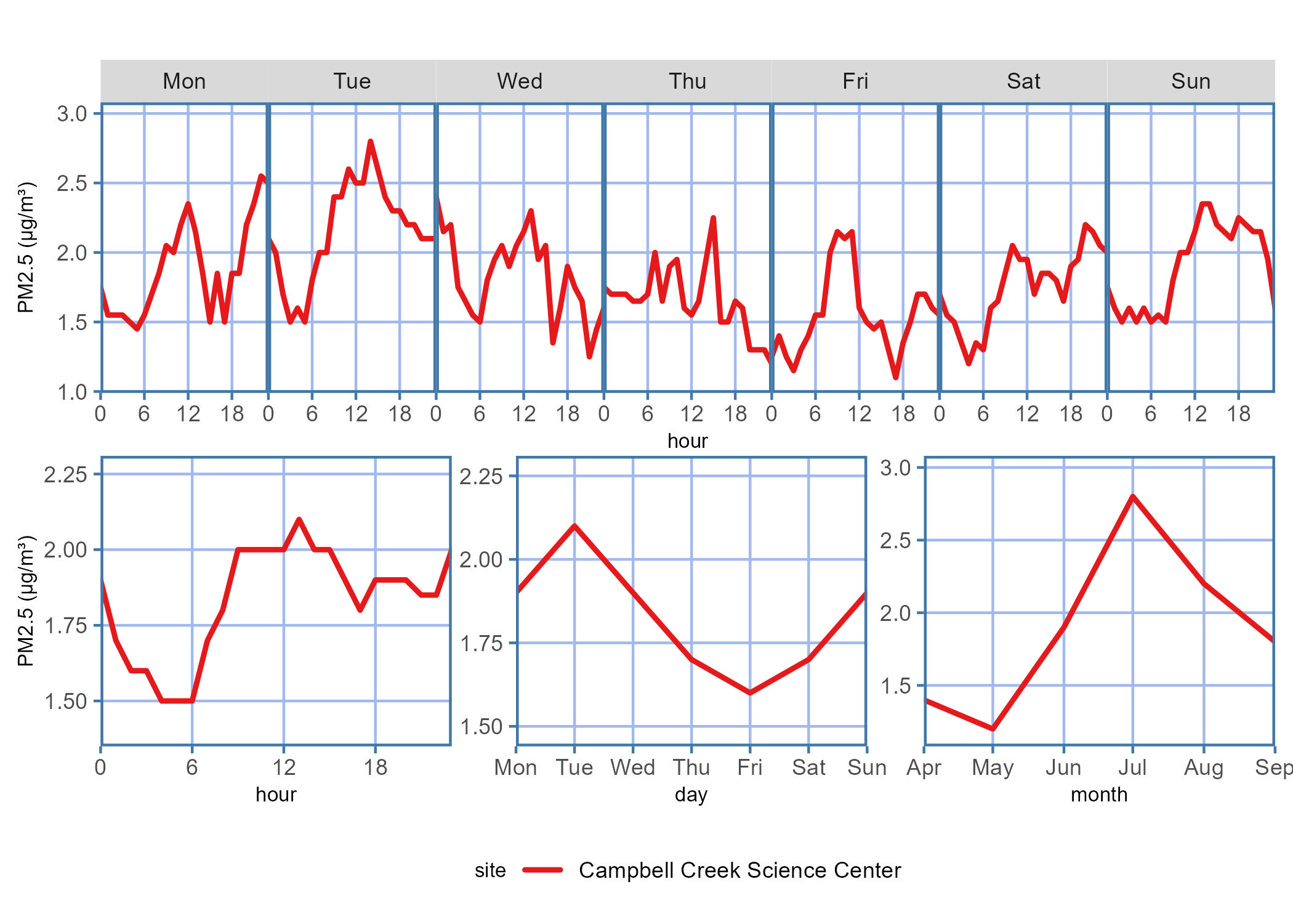 Campbell Creek’s PM2.5 ambient air quality for the summer 2025 season fell almost entirely in the Good range of the Air Quality Index (AQI; more information about AQI is provided in Resources) with only a few hours in June and July briefly reaching Moderate levels. Diurnal patterns show steady median PM2.5 concentrations throughout the hour of day and day of the week, with July experiencing slightly higher median concentrations than other summer months.