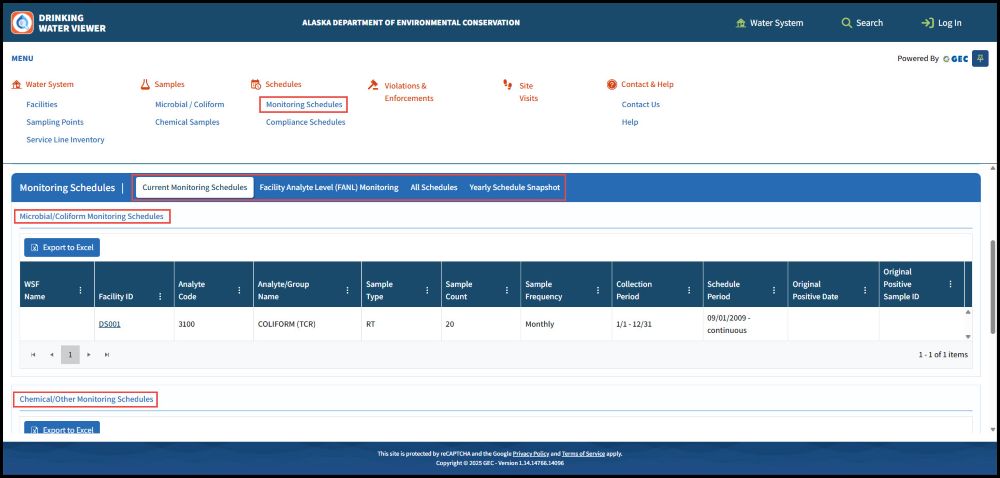 - Monitoring Schedules - Displays the microbial and chemical monitoring schedules that are currently in effect. This section can also display Facility Analyte Level (FANL) monitoring schedules and historical schedules.