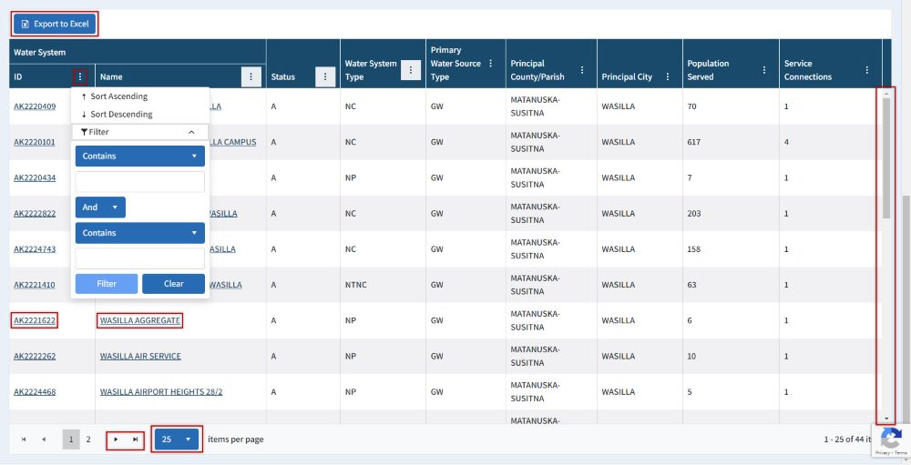 - Information on most pages will appear in a data grid. The data can be filtered and sorted by clicking on the three dots in each column header. Clickable links will appear in blue and underlined. For longer lists, you can scroll through the list and click the arrows to view more pages. You can also adjust the number of results that appear per page. Some pages can be downloaded by exporting to Excel.