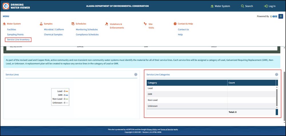 - Service Line Inventory – Displays service line information from the Lead Service Line Inventories (for Community and Non-Transient Non-Community systems)