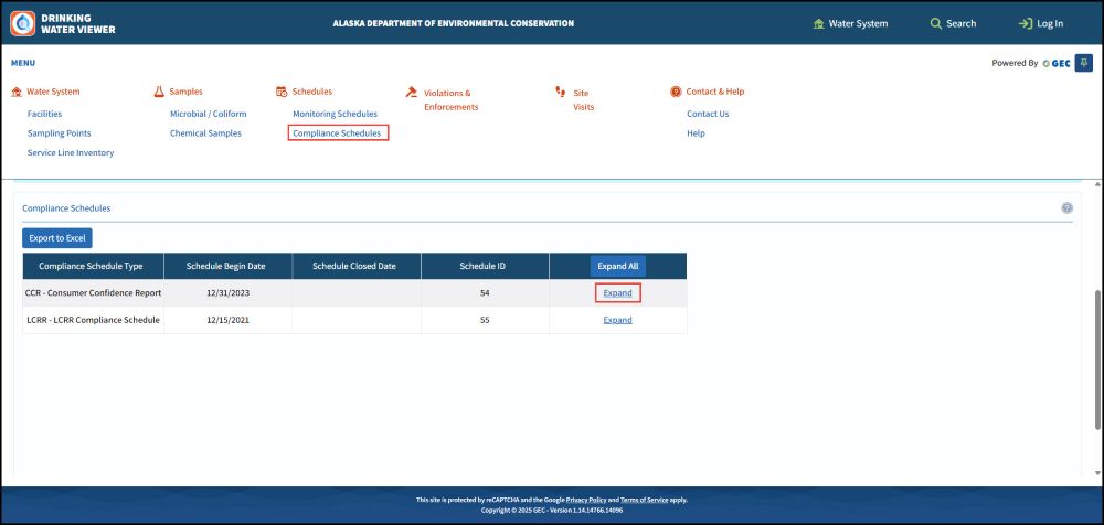 This page displays scheduled activities that must be completed by the due date to avoid violations and remain in compliance with Drinking Water regulations. Click on the plus sign to expand the details of the schedule activities.