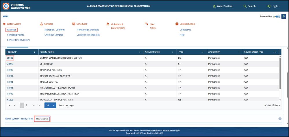 Water system facilities are facilities or locations related to the water system. The first section of this page shows all of the systems facilities. To see specific details about a specific facility, including associated sampling points, click on the facility ID. This will open a page with all the available details about the facility. The next section of this facilities page shows the flow between all facilities. You can open a visual diagram of the flow by clicking on "Flow Diagram".