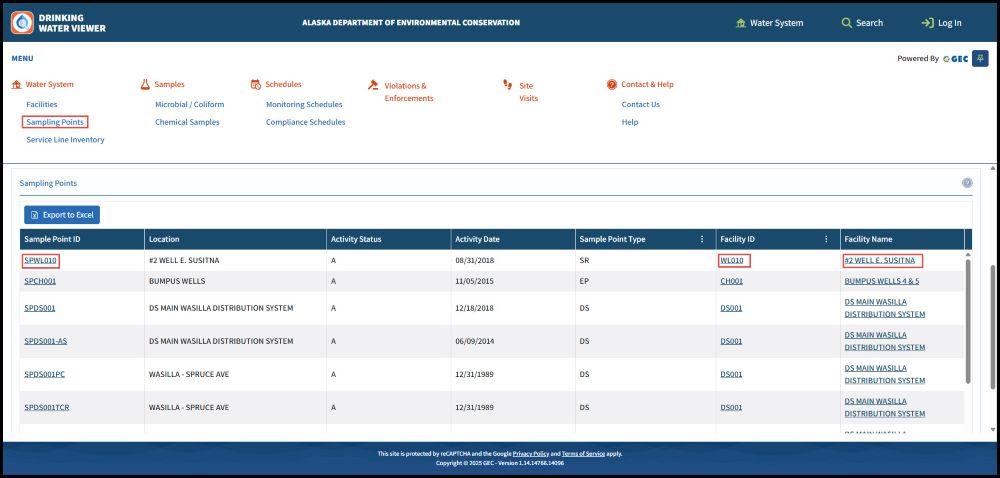 Sampling Points are locations where samples are collected. Sampling points can represent raw or finished water and serve different purposes. For more information about a specific sampling point, click the Sample Point ID link for that sampling point. For more information about the Facility associated with the sampling point, click on the Facility's ID to see the Facility Details.