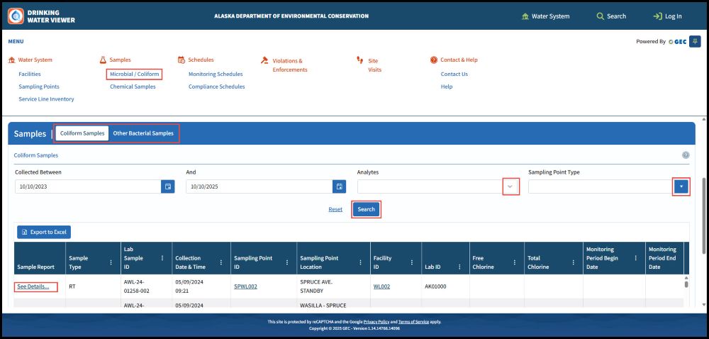 This page displays microbial, or bacterial, sample results collected in the last 2 years by default. You can use the search feature to adjust the timeframe and filter the results by analyte or sampling type point. You can also choose between coliform samples, sample summaries, and other bacterial samples. For more information about an individual sample, you can scroll to the far right in the data grid and click the “See Details...” link. This will also give you an option to download the individual sample report.