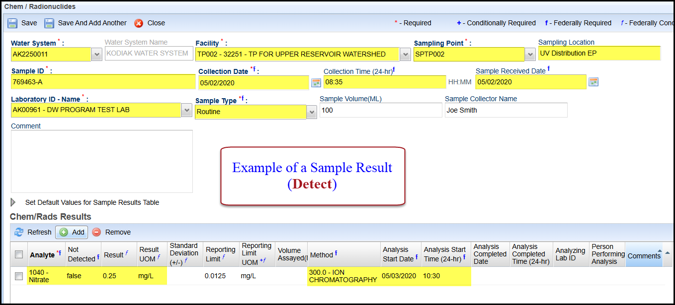 - Result**: Enter the appropriate reported result of the sample only if reporting a detect.