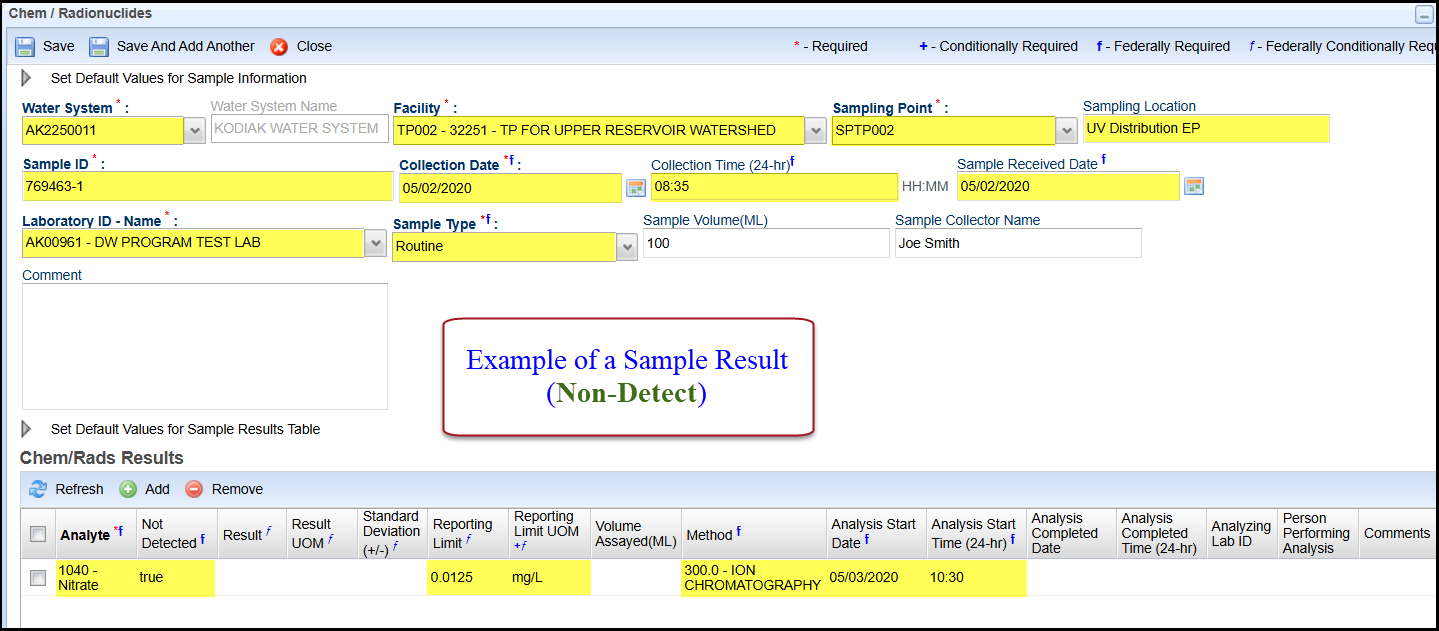 - Not Detected*: This field automatically defaults to a result of a non-detect (box will be checked) when entering a new sample result. If the contaminant is detected in the sample (level above detection limit) you will need to uncheck this box.
