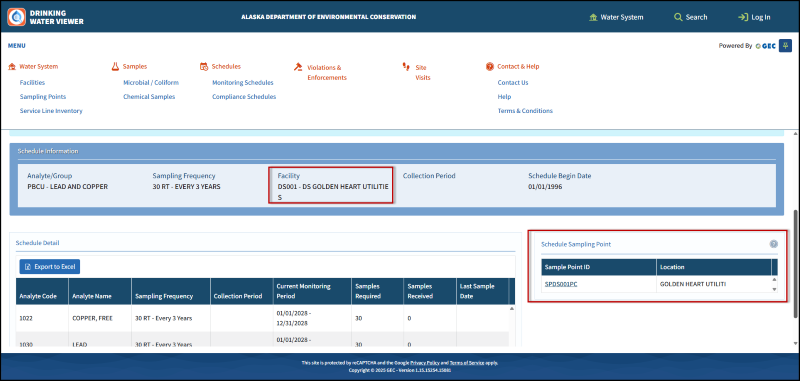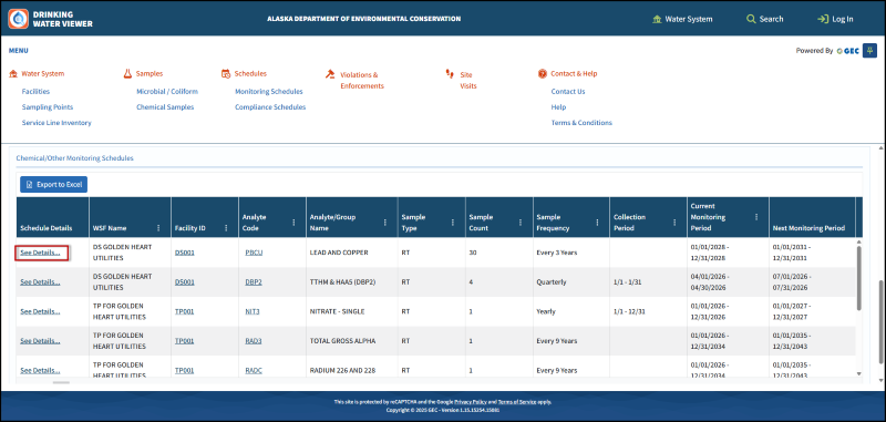 - Chemical/Other Monitoring - Use the Analyte/Group Name column to identify which schedule you are looking for, then click See Details in the first column. This will open the schedule details, which shows the Facility ID and the Sampling Point ID, as well as details about the required sampling.