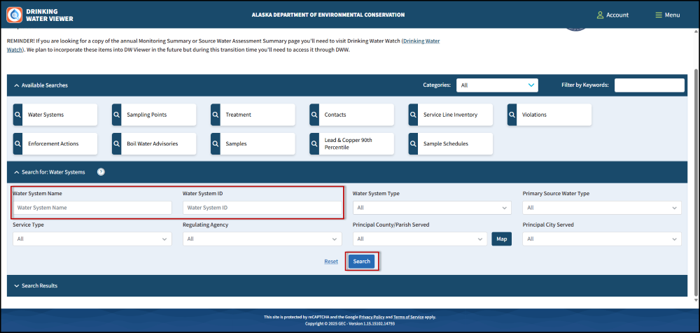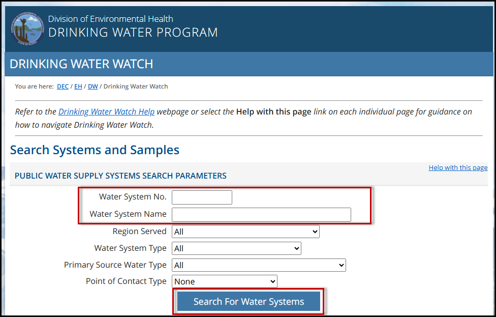 Search the water system number (PWSID) or water system name, then click Search for Water System. A list of results will load. Click on the system name to open the system information.