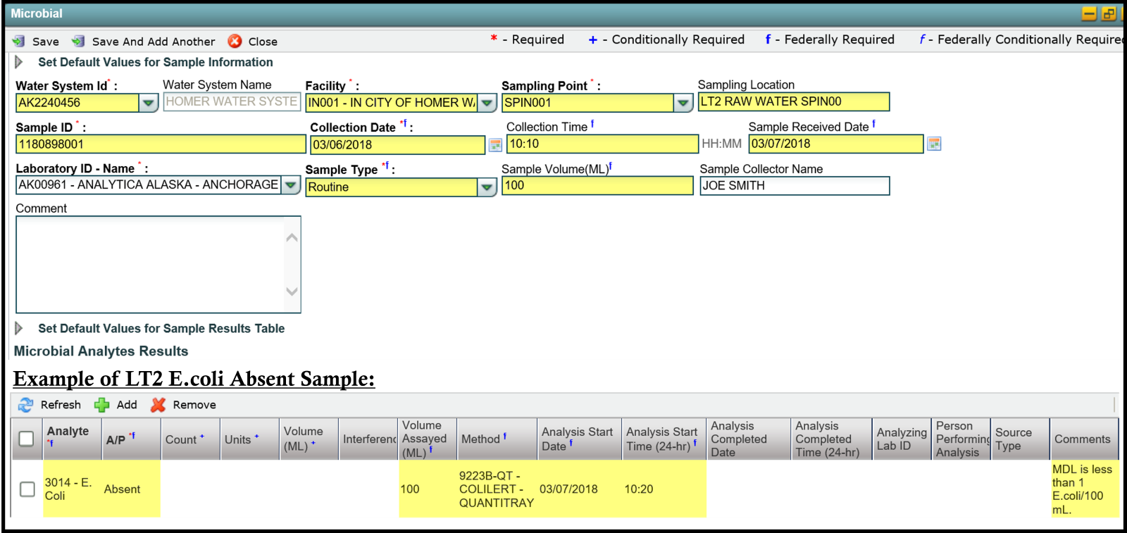 - Comment**: For samples where E.coli is NOT present, submit the method detection limit (MDL) for the analysis through this field. Use numbers, letters, dash or underscore. In particular, do NOT include quotation marks. NOTE: Do NOT use the less than (<) symbol. Example: MDL is less than 1 E.coli/100 mL.