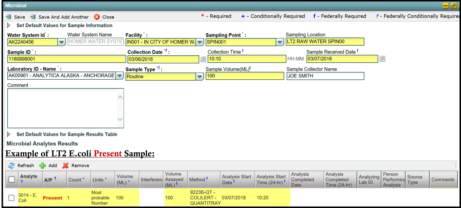 - Analyte [Code-Name]*: From drop down, select 3014- E.coli.