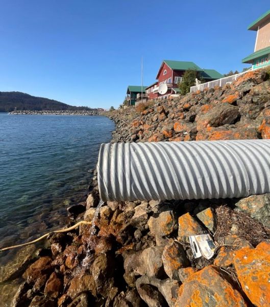 Stormwater flows out of an outflow pipe into Seldovia Bay. Photo by City of Seldovia.
